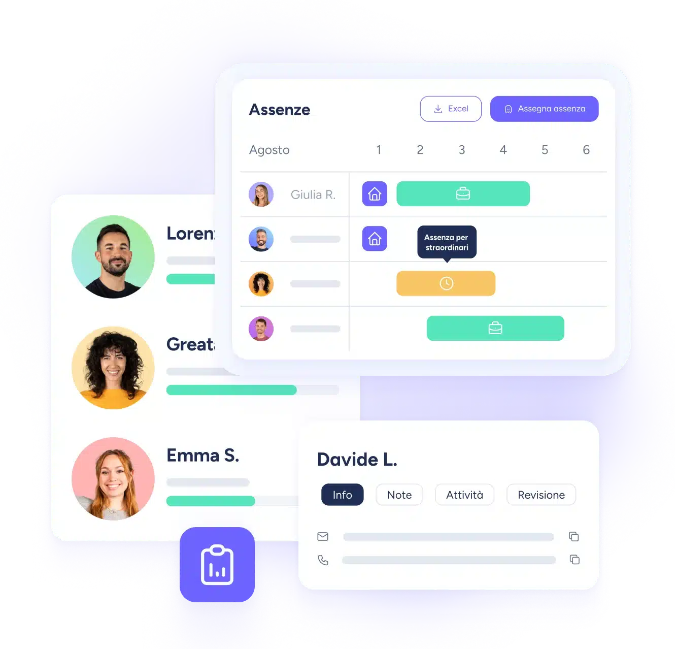 Le informazioni raccolte sui tuoi dipendenti saranno registrate nel nostro database dei dipendenti, insieme alle informazioni generate dal tuo team durante la loro interazione quotidiana con la piattaforma. Timbrature, richieste di ferie, dati sulla puntualità, valutazioni delle prestazioni, sondaggi di gradimento, corsi di formazione seguiti... Con un database costantemente aggiornato, sarai in grado di anticipare le decisioni, prevedere le tendenze e rilevare il potenziale del tuo team per introdurre azioni che migliorino il benessere in azienda e le competenze richieste.