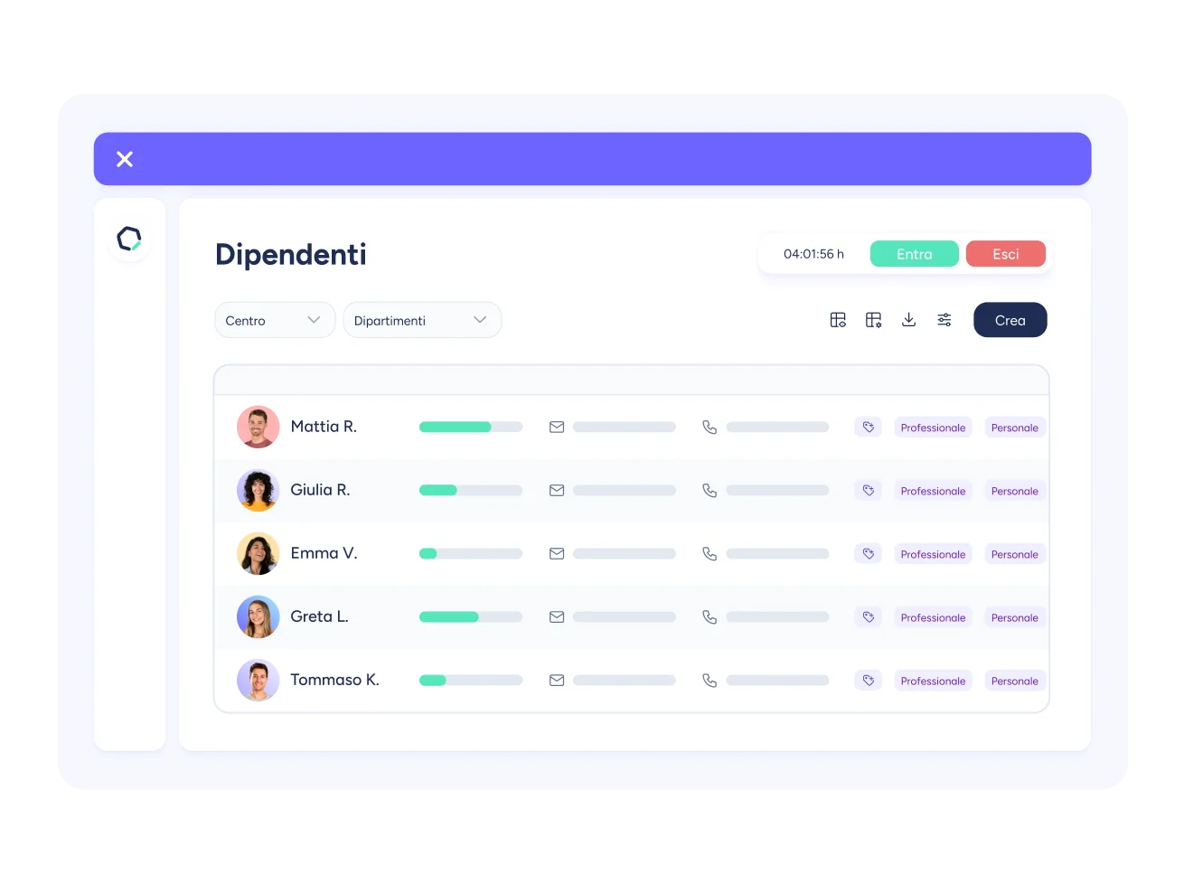 Puoi archiviare e accedere a tutte le informazioni relative ai tuoi dipendenti, inclusi dati personali, registrazioni di presenze, assenze, ferie, valutazioni delle prestazioni e formazione.